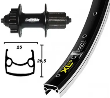 Skivbromshjul (infästning 6 skruvar) Kassettnav med stickaxel för 7-9delad kassett (distansring behövs för 7 delad kasset).Dubbelbottnad Aluminiumfälg 25*559mm (26"). Färg Svart.