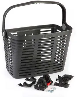 En smart korg som även fungerar på moderna cyklar. Monteras med ett snabbfäste i styre, diameter 22-25mm. Snabbkoppling för att enkelt kunna ta med korgen. Maxlast 5Kg. Mått B25xH35xD23cm. Djupet är 14cm i botten. Tillverkad i plast.