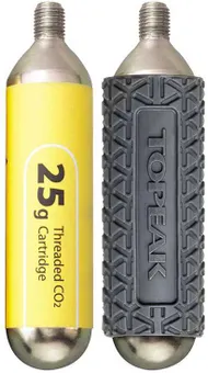 Topeak 25G Threaded CO2 Cartridge innehåller två kolsyrepatroner (2x25 gram) med gängad topp och passar kolsyrepumpar (CO2-pumpar) för gängade patroner samt ett fodral i silikon. Passar till Topeak HybridRocket MT, AirBooster och Micro AirBooster.