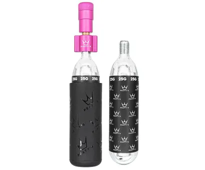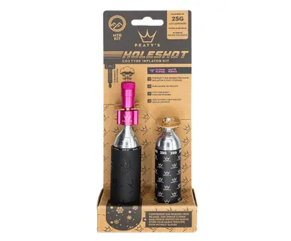 Peaty's Holeshot CO2 DäckinflatorAlla vet att en rak linje är den snabbaste vägen till målet. Därför har Peaty's skapat sin Holeshot CO2 Däckinflator rak istället för att ha en 90-graders böjning. Den här raka linjen ger snabbare luftfyllning och fyller ditt däck snabbare samtidigt som den ger mindre belastning på dina tubelessventiler.Munstycket är så litet och lätt som möjligt och gör det enkelt att få plats i fickan, cykelryggsäcken eller fästa det på cykelramen med remmar.Holeshot CO2 Däckinflator är tillverkad av CNC-fräst 6061 aluminium och har en patenterad ventildesign. Munstycket har noggrant genomtänkta detaljer som till exempel o-ringar i högkvalitativt gummi, allt förpackat i de välkända anodiserade färgerna från Chris King.Peaty's har inte bara skapat ett fantastiskt munstycke, utan följer också upp med ett högkvalitativt skydd till CO2-patronen. Skyddet isolerar mot kyla och är tillverkat av silikon. Detta skyddar handen mot kylan som utvecklas vid tömning av CO2-patronen.Nyckelfunktioner:- Tillgänglig i 12 Chris King-färger.- Patentsökt design med rak linje.- Tryck ner munstycket på ventilen för att fylla luft- Unikt silikonskydd med stängd botten skyddar fingrarna mot kyla under fyllning.- Varje kit innehåller 1 munstycke, 2 CO2-patroner och 1 silikonskyddLäs instruktionerna innan användning:- Se till att CO2-patronen är helt tömd efter användning genom att trycka munstyckets huvud upprepade gånger mot en hård yta som tål låga temperaturer.- Passar alla 16g/25g CO2-patroner- Använd alltid det medföljande silikonskyddet för att skydda händerna mot kyla under fyllning.- Förvara alltid CO2-patronerna och munstycket åtskilda för att undvika oavsiktlig luftutsläpp.Varning:1) Använd aldrig CO2-patroner större än 25g2) Om du behöver använda mer än en CO2-patron för att fylla däcket, vänta alltid minst 30 sekunder innan en ny patron används.3) Se till att CO2-patronen är ordentligt skruvad i gängorna på munstycket. Om patronen inte sitter ordentligt kan luften inte fyllas i däcket samtidigt som skador kan uppstå.4) Kontrollera att patronen är punkterad innan användning genom att trycka munstycket mot en hård yta som tål kraftig kyla och kontrollera att en fri ström av gas kommer ut.5) Ta inte bort patronen från munstycket innan patronen är helt tömd.6) Kontrollera att patronen är tömd genom att trycka munstycket upprepade gånger mot en hård yta som tål kraftig kyla.7) Rikta inte munstycket och patronen mot dig själv eller andra under användning.8) Använd inte produkten om det uppstår skador på munstycket eller patronen.9) CO2-patronen får aldrig utsättas för stark värme och ska aldrig förvaras i temperaturer över 49C eller i ett slutet fordon.10) Använd handskar för att undvika frostskador.11) Munstycket och patronen kan bli mycket kalla under användning. Skruva inte ut patronen innan den har blivit tillräckligt varm för att kunna röras vid.12) Förvara utom räckhåll för barn.