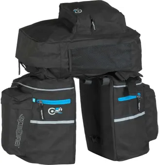 Väskkit med två sidoväskor och en toppväska som kan tas bort och användas som ryggsäck. Regnskydd ingår. Total packvolym 50 liter.