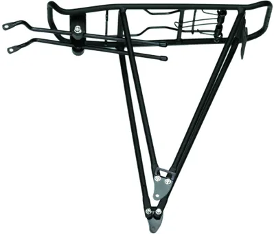 Svart Aluminium pakethållare med långa stag till övre fästet ( passar utmärkt till cyklar med små ramar) - Fjäderklämma - Fäste för baklykta. - Levereras komplett med monterings detaljer. Färg Svart. Maxlast 25kg